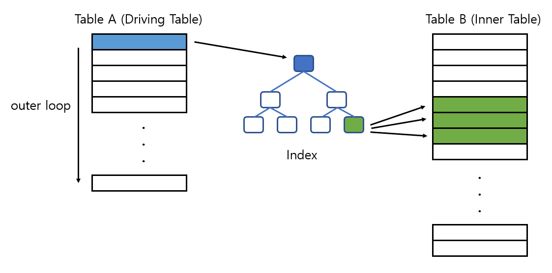 내부 테이블의 결합키에 인덱스가 존재하게 되면 Driving Table 에서 Inner Table 로 스캔을 하러 갈 때 모든 행에 대해 스캔을 할 필요가 없게 됩니다.