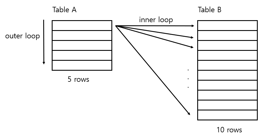 위 그림에서 예를 들어보면 Table A 의 행에서 출발해 Table B 의 각 행들을 스캔하기 시작합니다.
