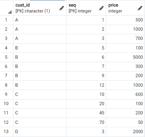 select cust_id, seq, price