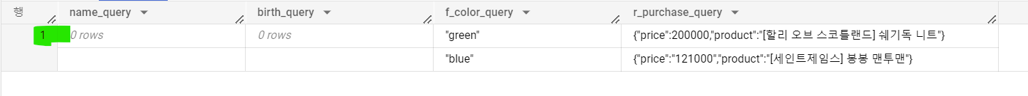 - recent_purchase 의 경우, 배열 안에 JSON 형태의 값이 들어있기 때문에 JSON_QUERY_ARRAY 함수로만 파싱이 가능함