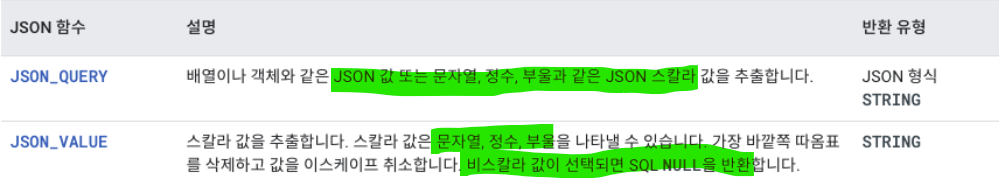 JSON_VALUE_ARRAY 와 JSON_QUERY_ARRAY 함수를 비교해보며 살펴보면 아래와 같이 정리해볼 수 있습니다.